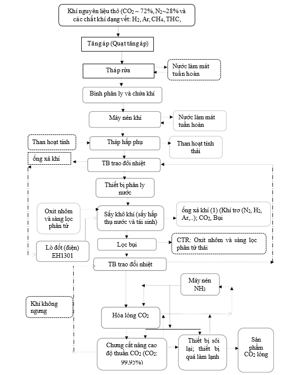 Trên cơ sở chất lượng khí nguyên liệu đầu vào tính theo giá trị khô (không tính hơi nước bão hòa đi theo) với khí có độ thuần CO2 khoảng ~72%, N2 khoảng ~28% và các thành phần vi lượng khác dạng vết bao gồm; các loại khí trơ (H2, Ar,..) các hợp chất hữu cơ (CH4, THC,…) và các hợp chất lưu huỳnh (H2S,..)