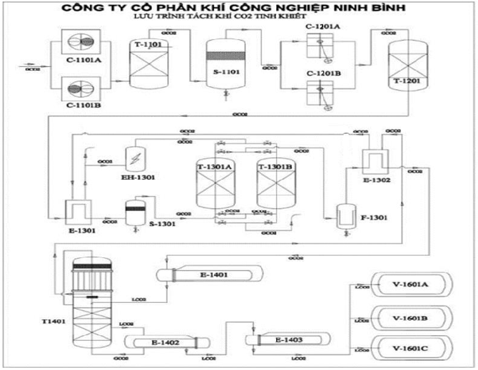 Khí nguyên liệu sản xuất CO2 lỏng với lưu lượng khoảng 12000m3/h (6.000 m3/h/dây chuyền) được lấy từ khi đuôi sau hệ thống xử lý của nhà máy Đạm Ninh Bình qua đường khu công nghiệp vào nhà máy sản xuất CO2 lỏng tinh khiết.