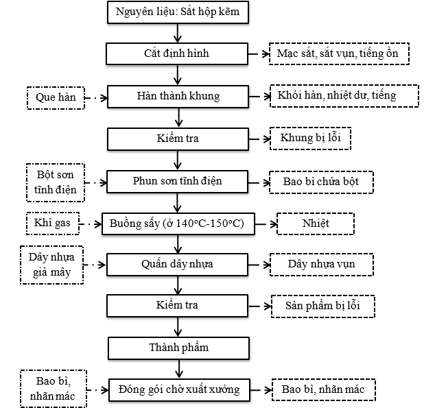 - Theo loại hình sản xuất của nhà máy chỉ tập trung sản xuất hàng đan, không sản xuất hàng trần nên không có công đoạn xử lý bề mặt kim loại. Khung sắt sau khi hàn được kiểm tra đạt chất lượng và đưa trực tiếp vào công đoạn phun sơn nên nhà máy không có phát sinh nước thải từ công đoạn sản xuất.